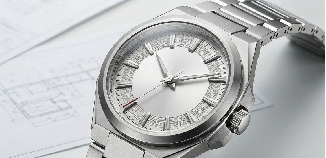 - 文字板のセクターに刻まれた独自パターンが知的な印象を与える